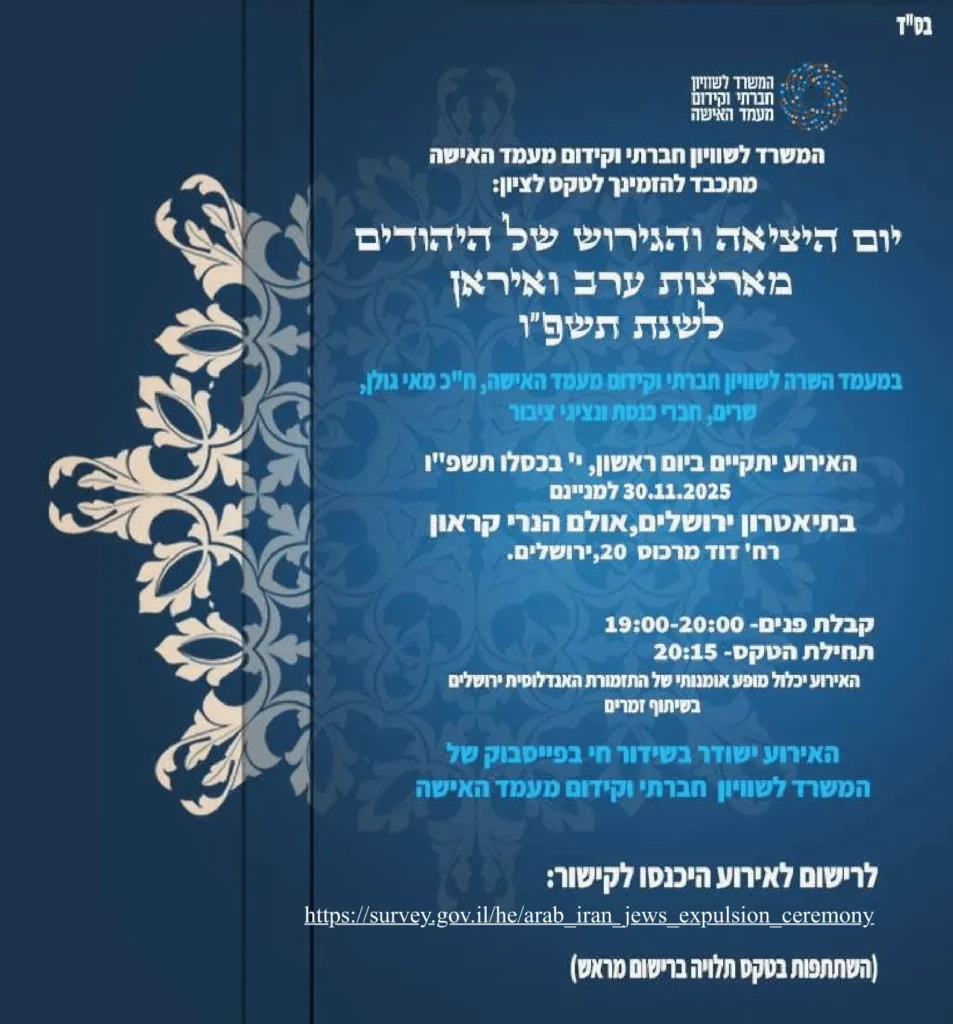 יום היציאה והגירוש של היהודים מארצות ערב ואיראן לשנת תשפ״ו, 30.11.2025, תיאטרון ירושלים